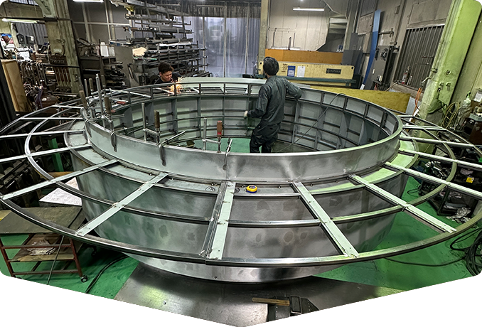 金属板を回転させながら塑性変形させるへら絞り(スピニング)加工業。照明器具や工業設備(建機、空調)用、アウトドア製品特殊用途に使用せれる外径Φ1000㎜以上の特大品まで多様なへら絞り製品を開発から試作量産まで行う数少ないへら絞り加工専門メーカー。